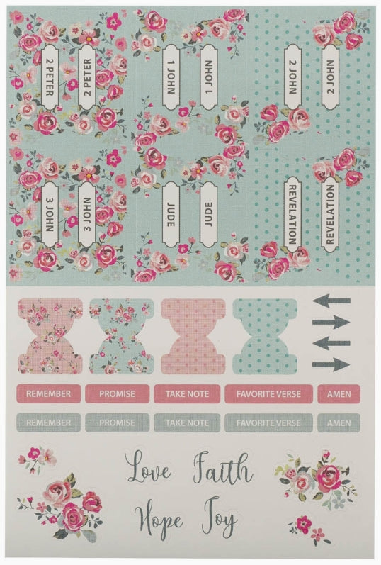 The Pink and Blue Old and New Testament Bible Index Tabs serve a dual purpose: they add a feminine touch to your Bible and simplify navigating its books. Pink and blue floral design, Pink background with pink florals for Old Testament, Blue background with pink florals for New Testament, Self-adhesive, Pre-cut, 6 sheets, 66 Bible book names, 25 stickers to color, 31 stickers to highlight passages, Placement guide included, Suited for Bibles between 12 and 7 inches, Tab size: 1.4" (35mm), Packaging size: 8" x 4.4" x .1" (203 x 112 x 3mm)